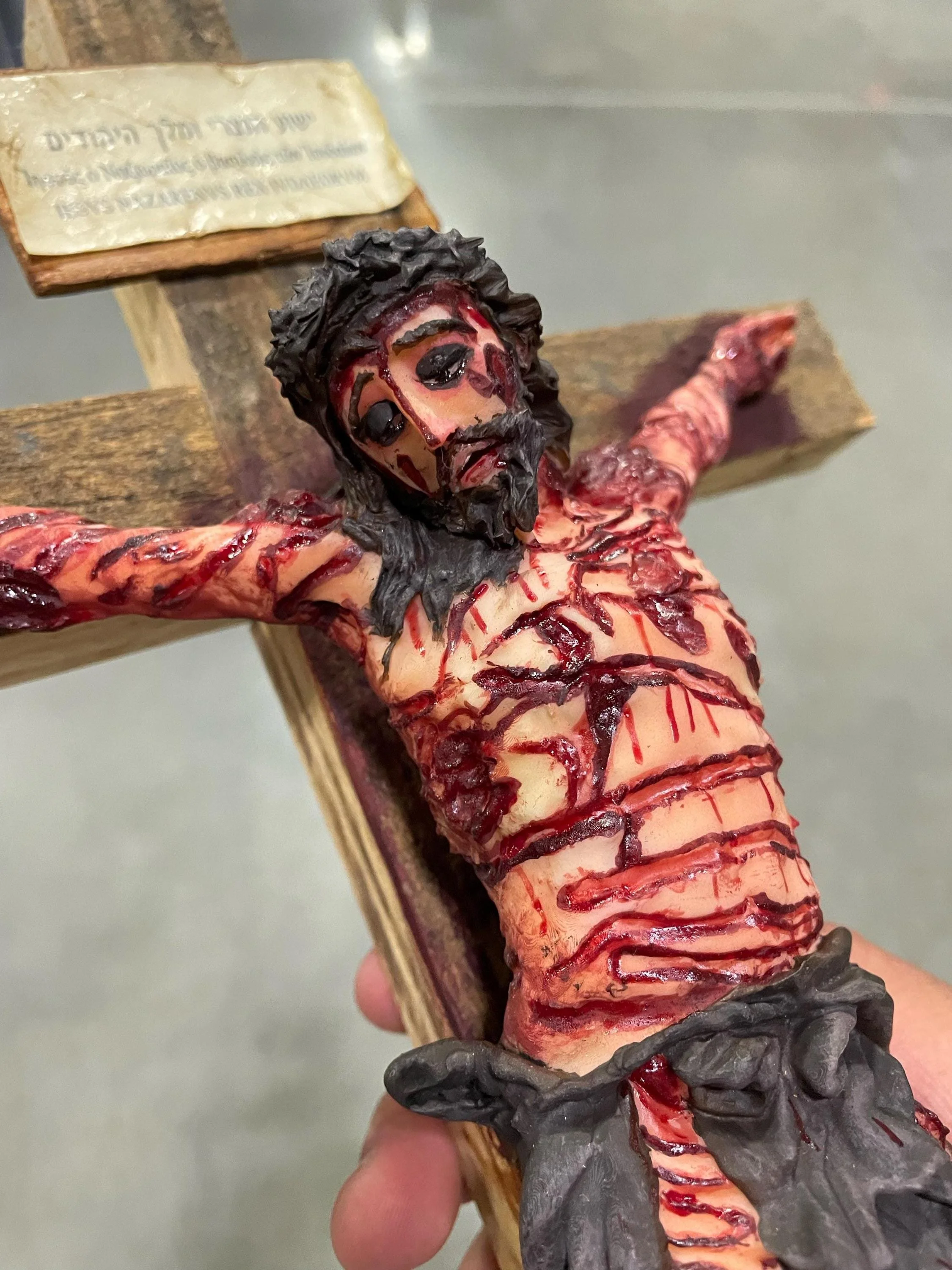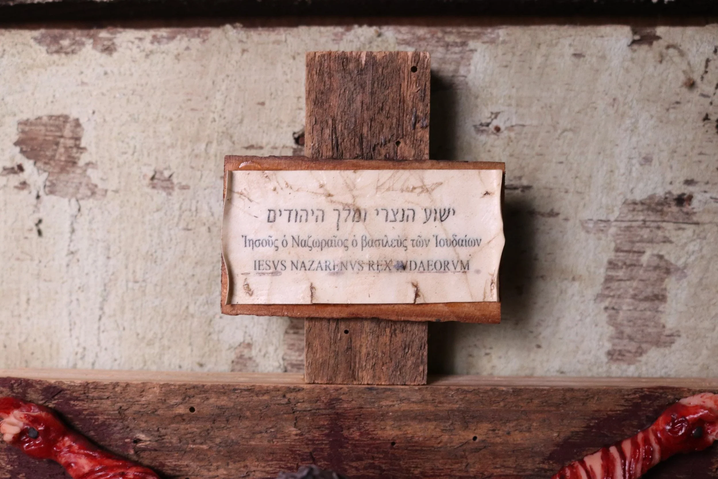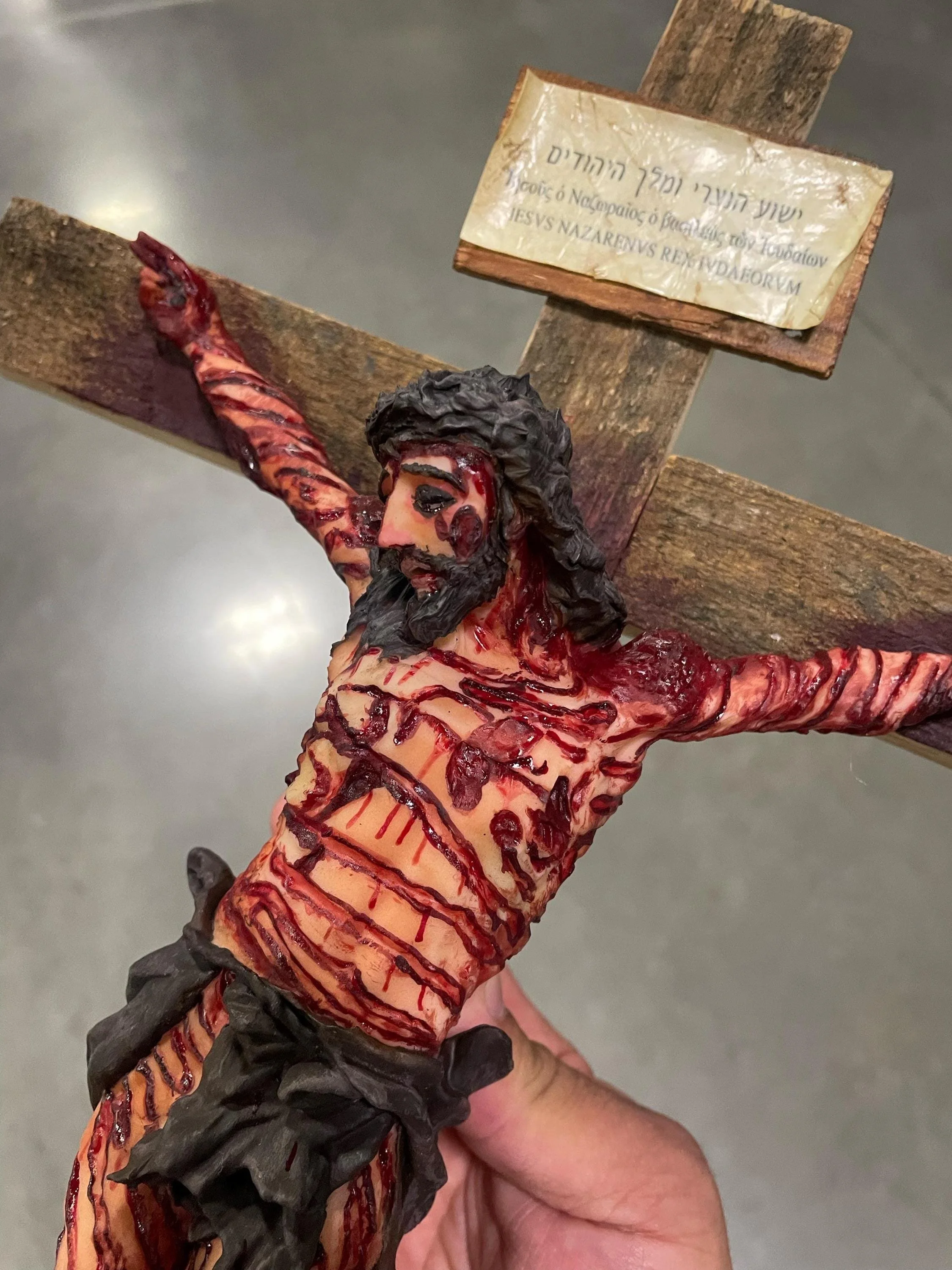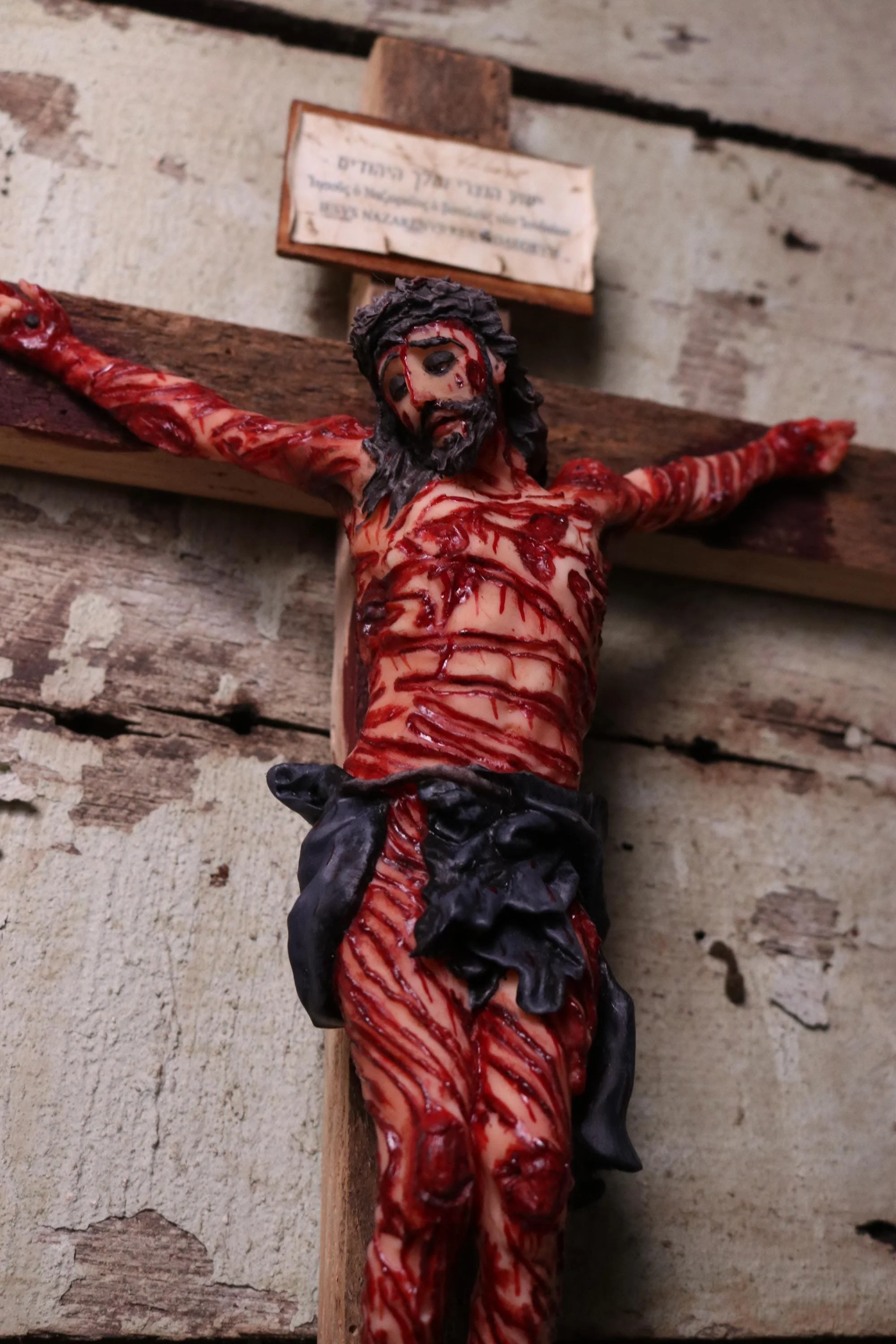 The figure is mounted to a cross of reclaimed wood, chosen not only for its strength and beauty but also its profound symbolism: once discarded or forgotten, the wood is given new life by carrying the image of Christ. In this, it becomes a reflection of our own redemption, as God restores us from death to life in Him.
