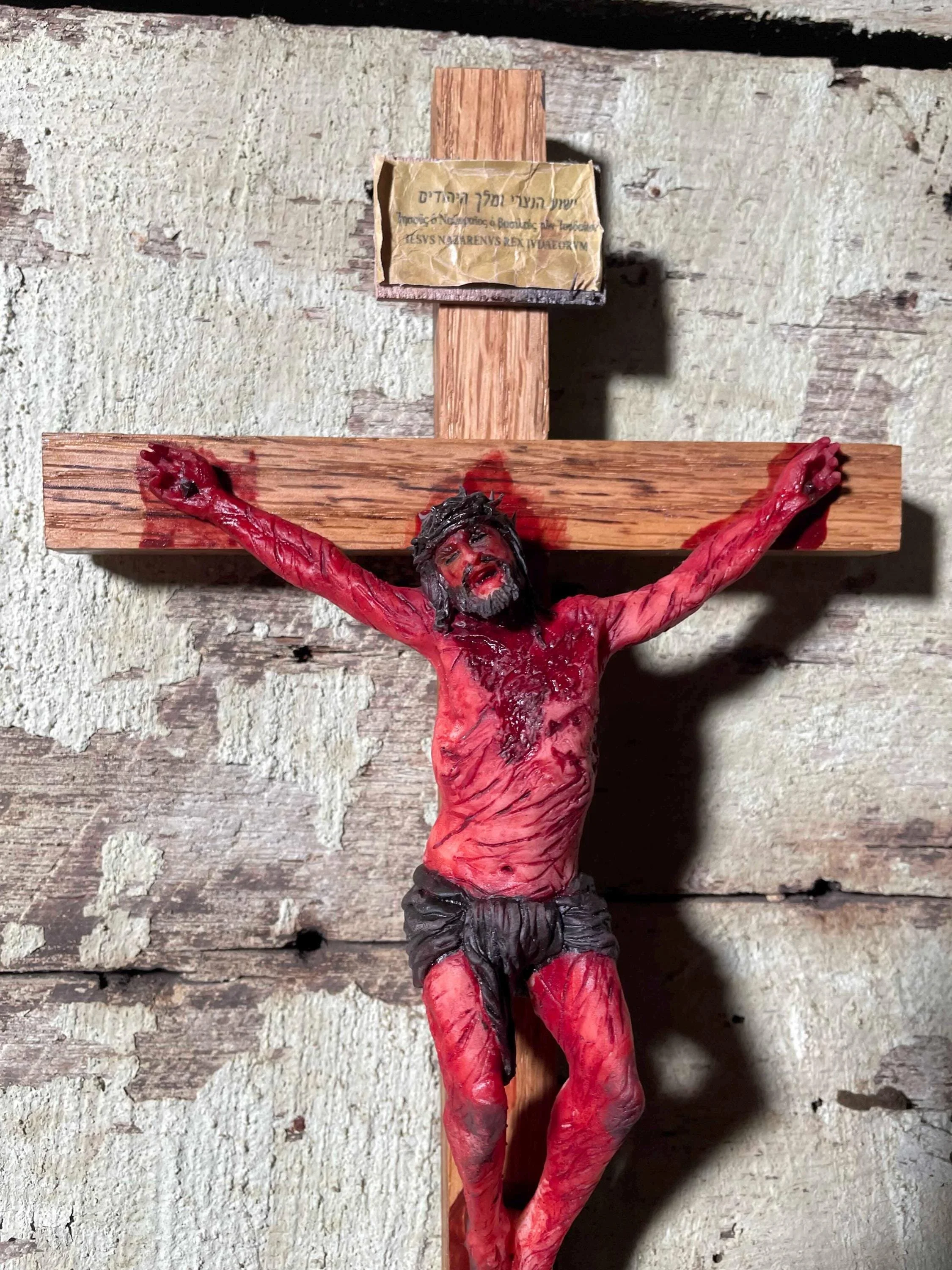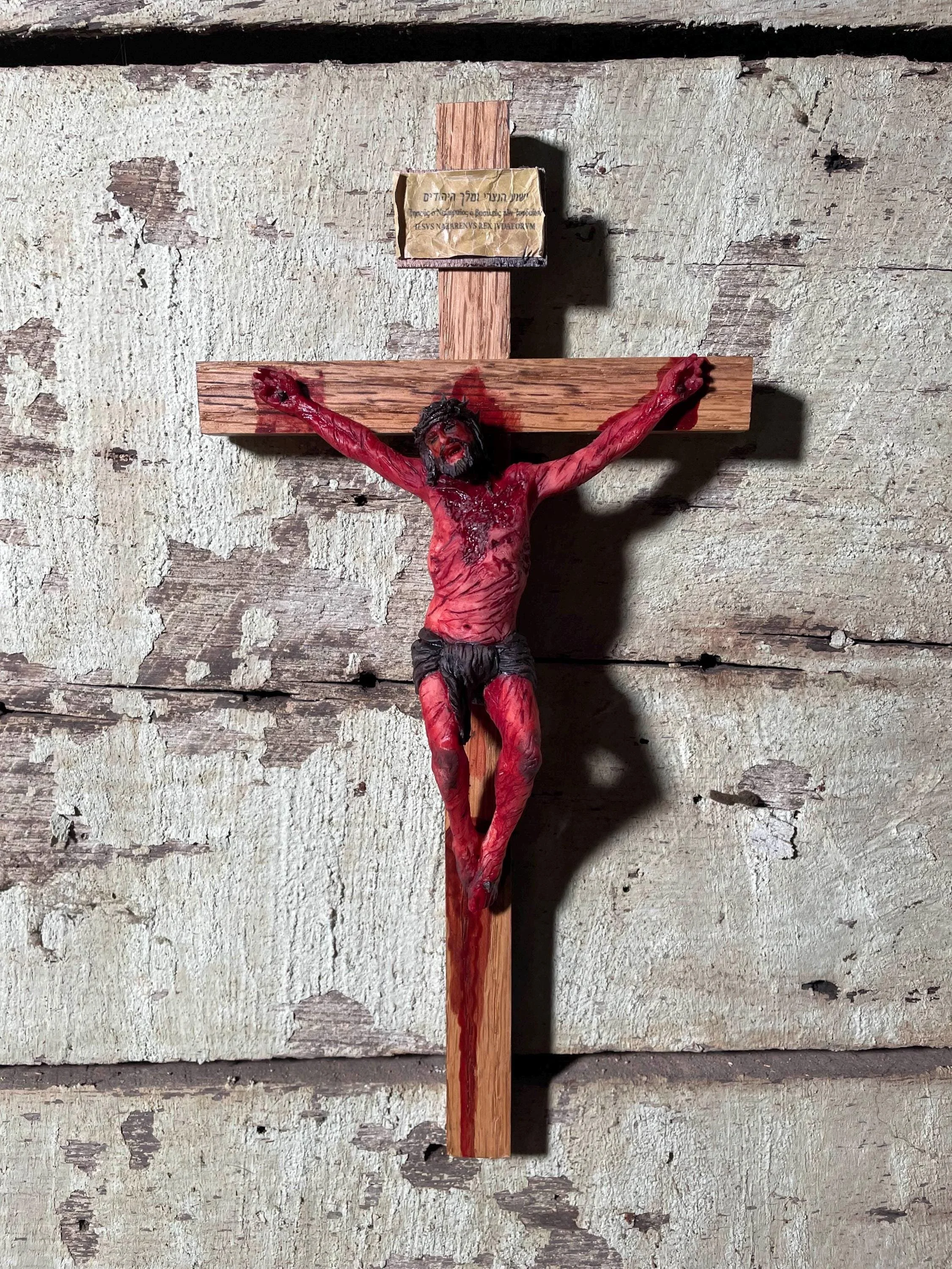 The INRI sign bears all three traditional languages—Hebrew, Greek, and Latin—just as it was placed above Our Lord at Golgotha.
