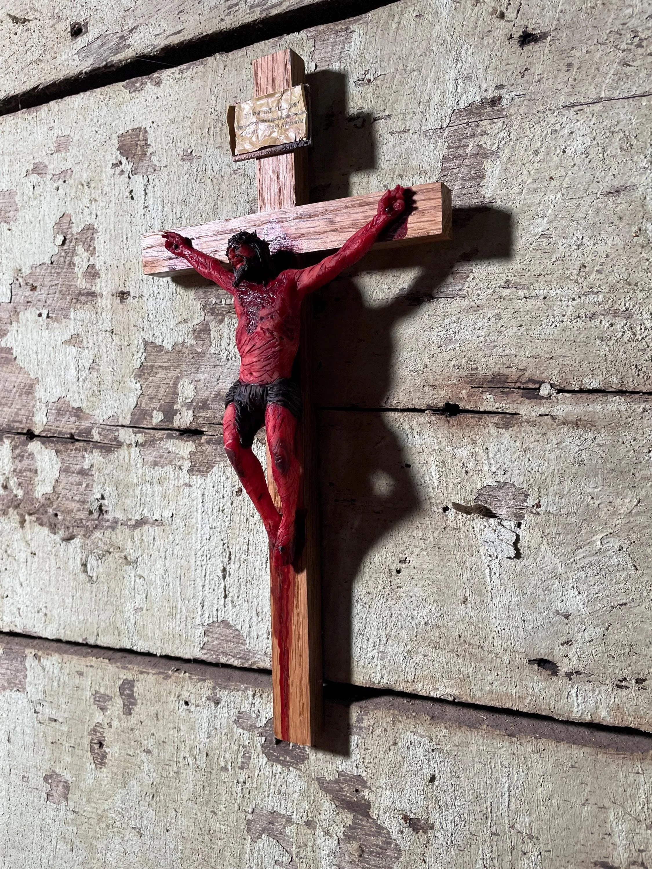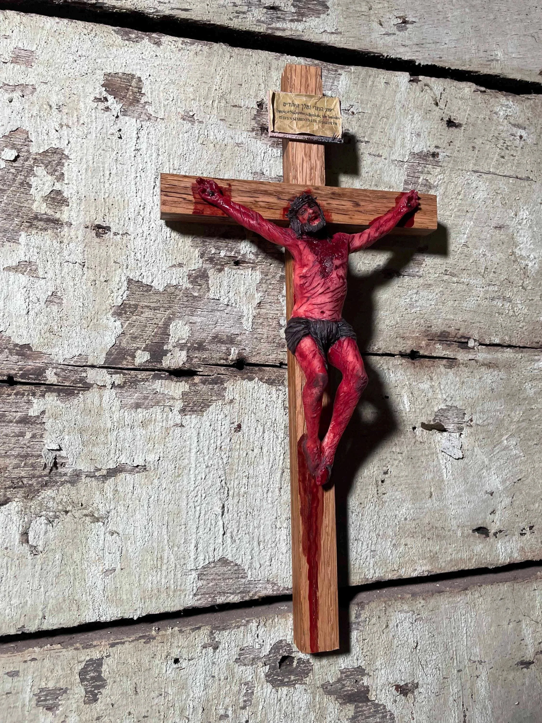 This striking crucifix, inspired by The Passion of the Christ film directed by Mel Gibson and starring Jim Caviezel, invites deep meditation on the suffering and sacrifice of our Lord.